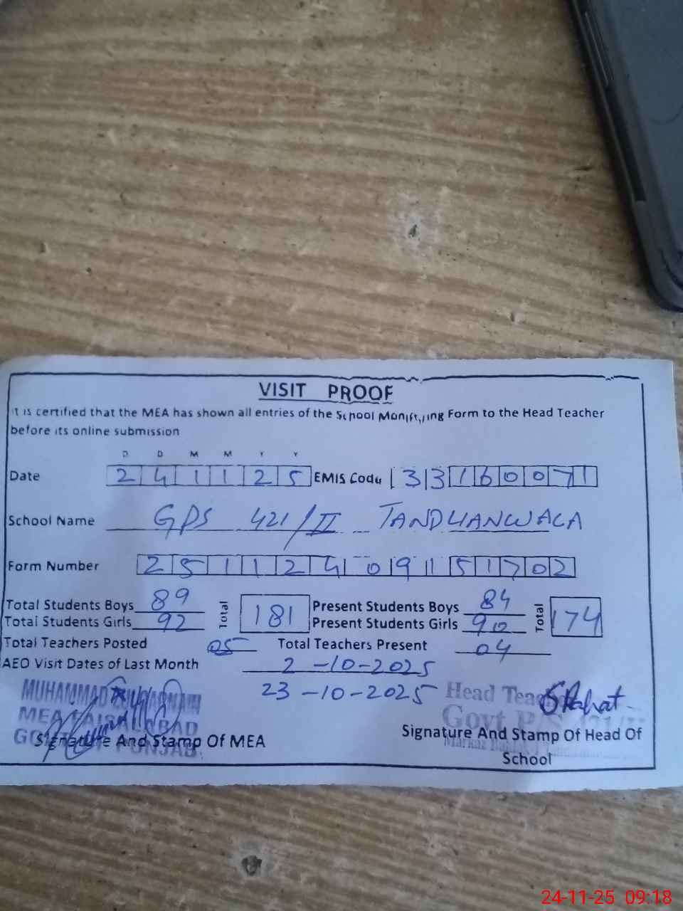 | Attendance Register | Head Teacher | MEA with School | Visit Proof |