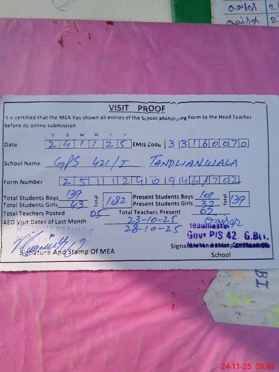 | EMIS Code: 33160070 | Name of School: GPS CHAK NO 421 GB I | |||