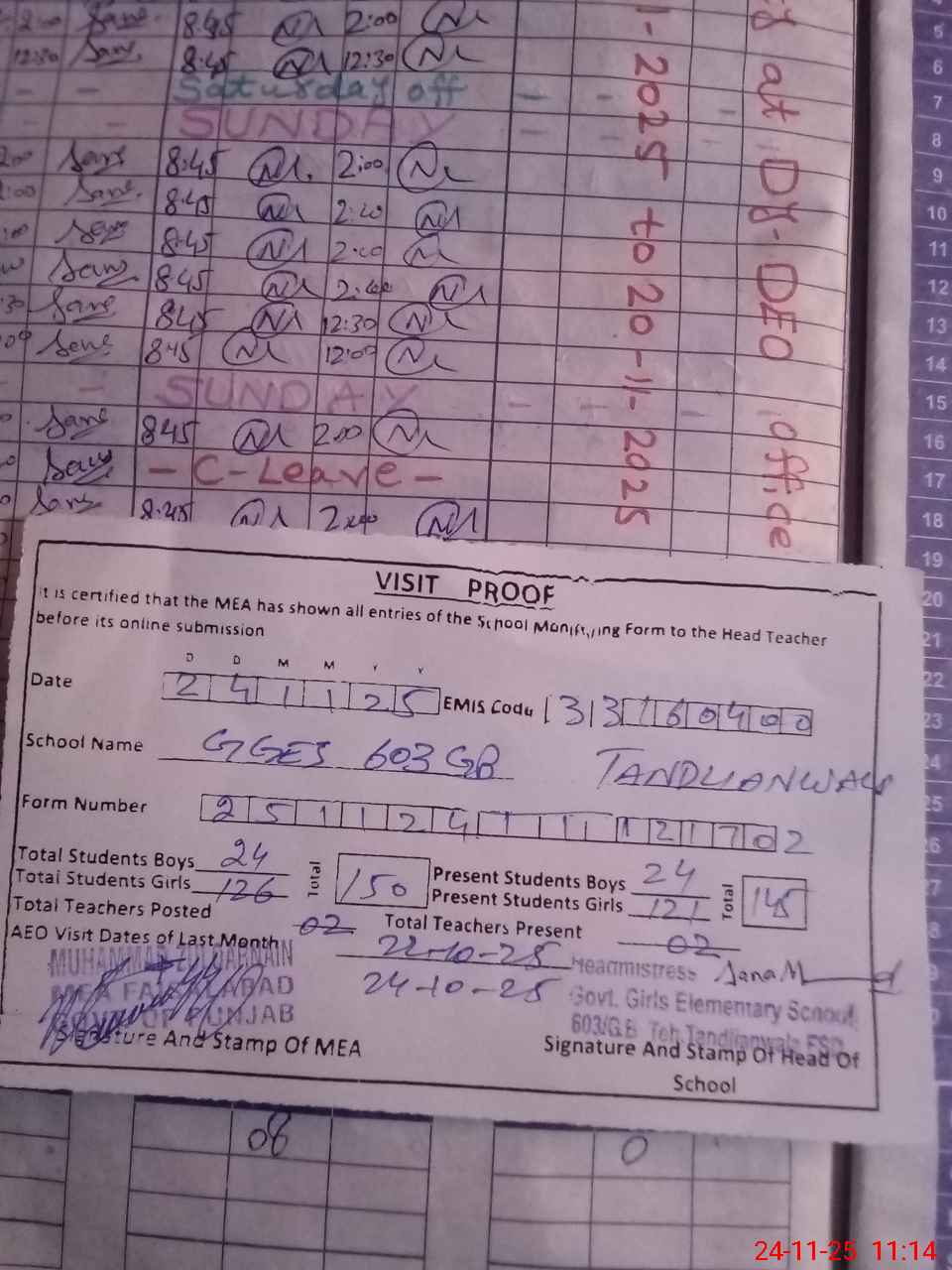 | Attendance Register | Head Teacher | MEA with School | Visit Proof |