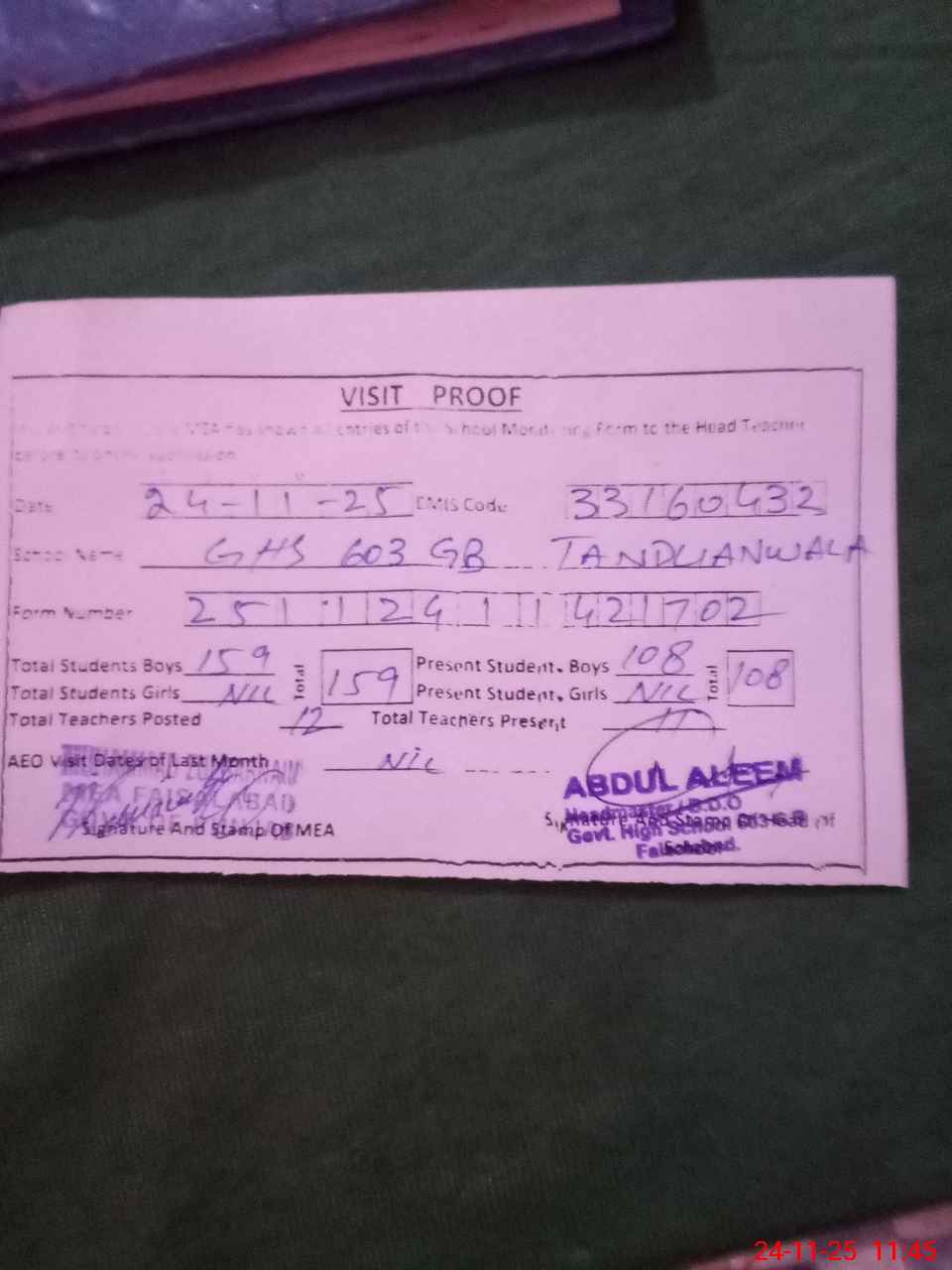 | EMIS Code: 33160432 | Name of School: GHS CHAK NO.603/GB | |||