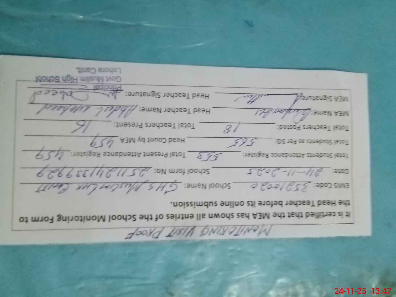 | EMIS Code: 35210020 | Name of School: GHS MUSLIM LAHORE CANTT | |||