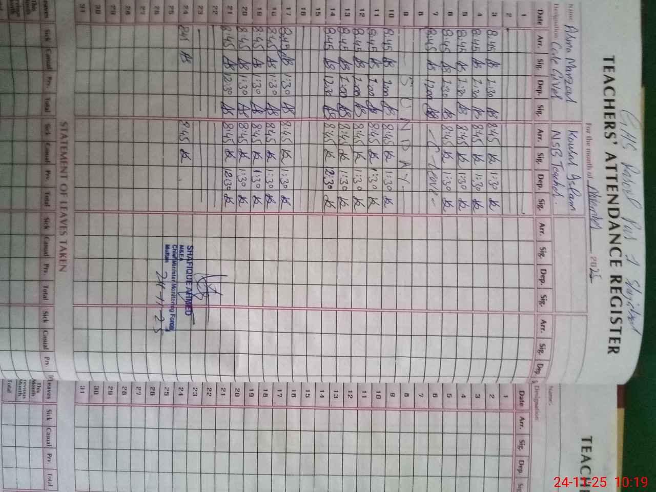 | CNIC | Full Name | Designation | R/C | Absence During Last Calender Month |
