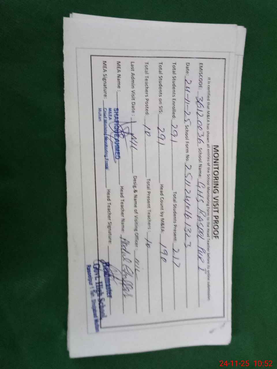 | Monitoring Date: 24-11-2025 | Start Time: 24-11-2025 10:16 AM | End Time: 24-11-2025 10:52 AM | Name of MEA: SH**** AH**** | |