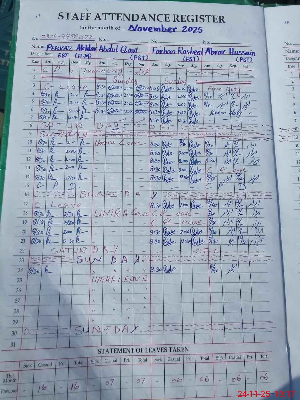 | CNIC | Full Name | Designation | R/C | Absence During Last Calender Month |