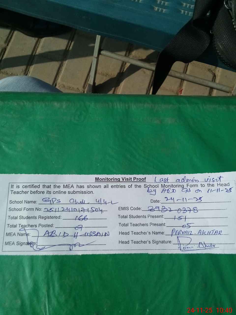 | Attendance Register | Head Teacher | MEA with School | Visit Proof |
