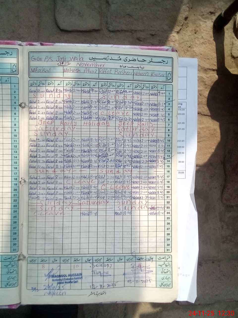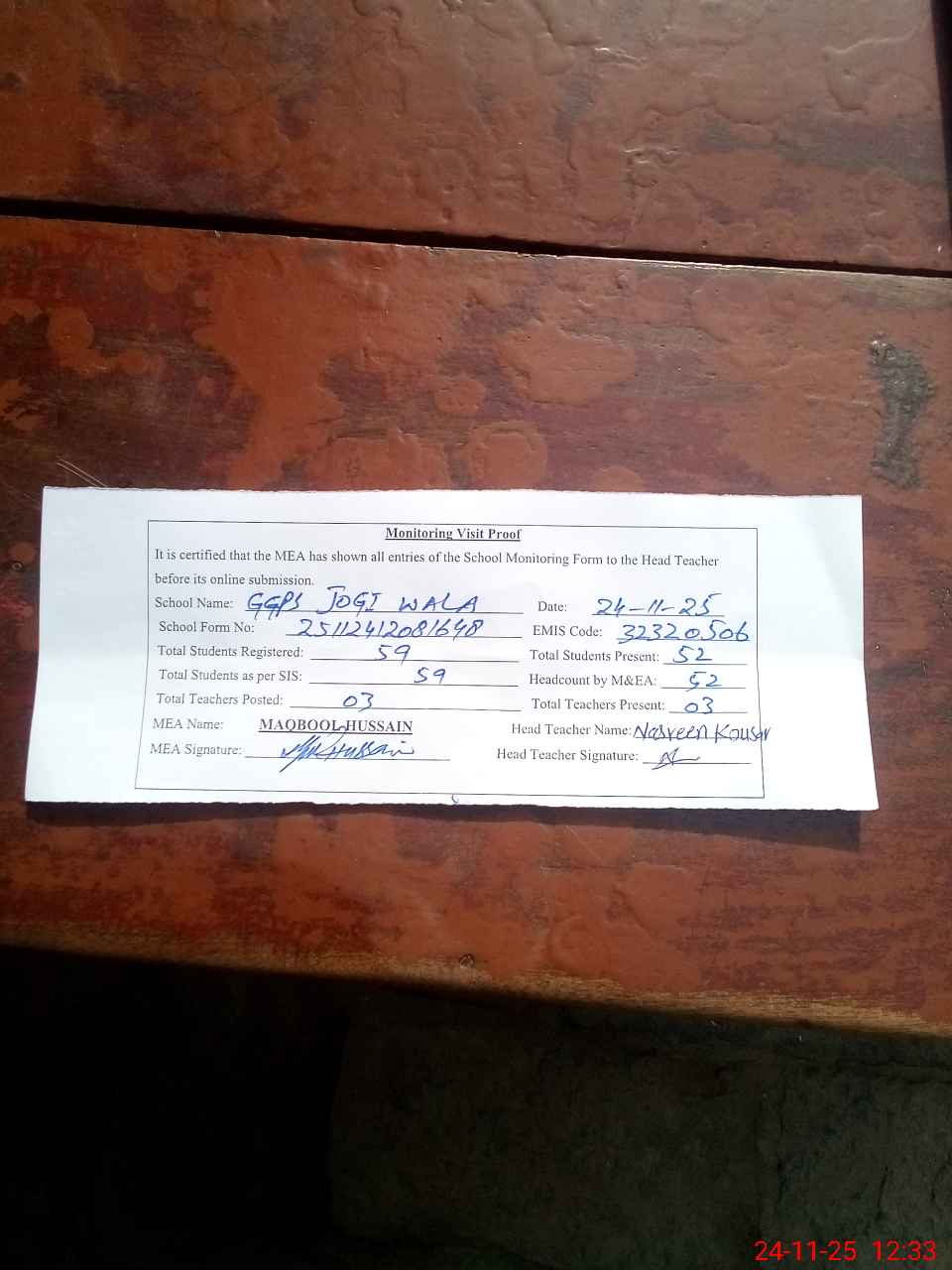 | Attendance Register | Head Teacher | MEA with School | Visit Proof |