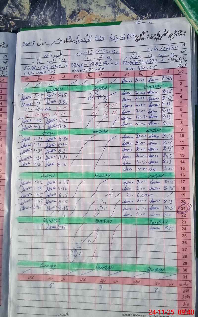 | CNIC | Full Name | Designation | R/C | Absence During Last Calender Month |