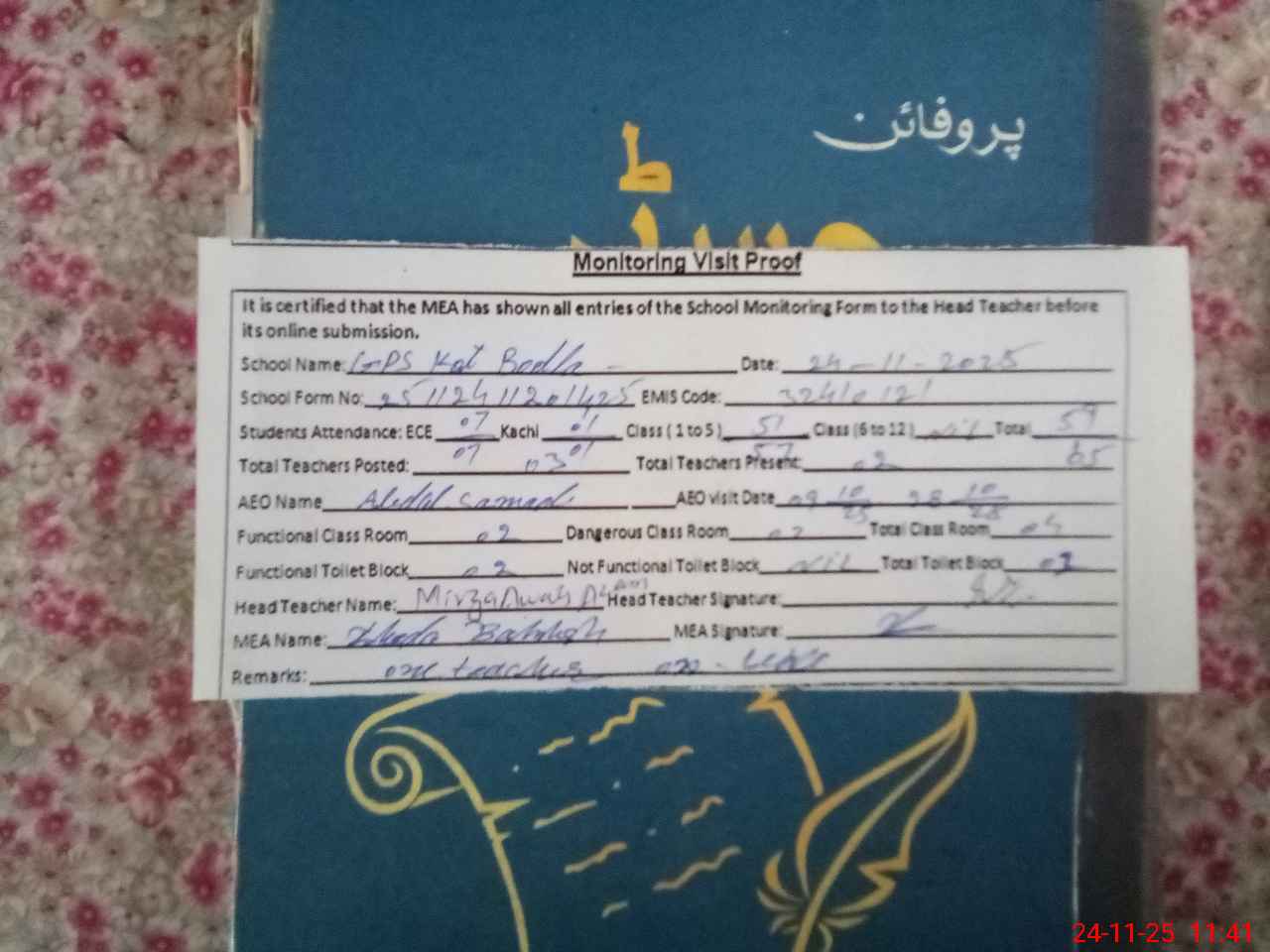 | Attendance Register | Head Teacher | MEA with School | Visit Proof |