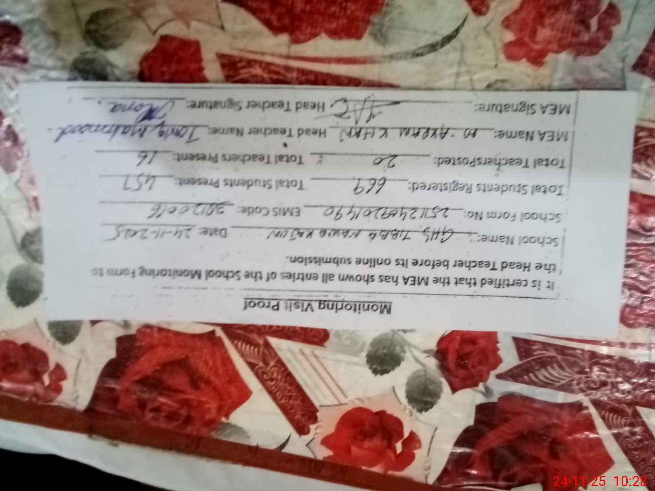 | Certified that this School was Inspected by the Undersigned MEA/DMO Today and the Information Stated Above is as Per Record. | |||||