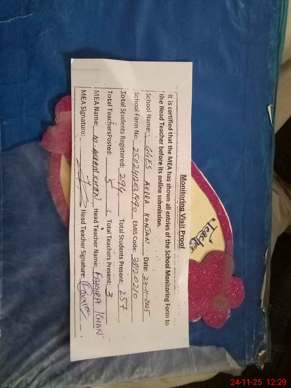 | Attendance Register | Head Teacher | MEA with School | Visit Proof |
