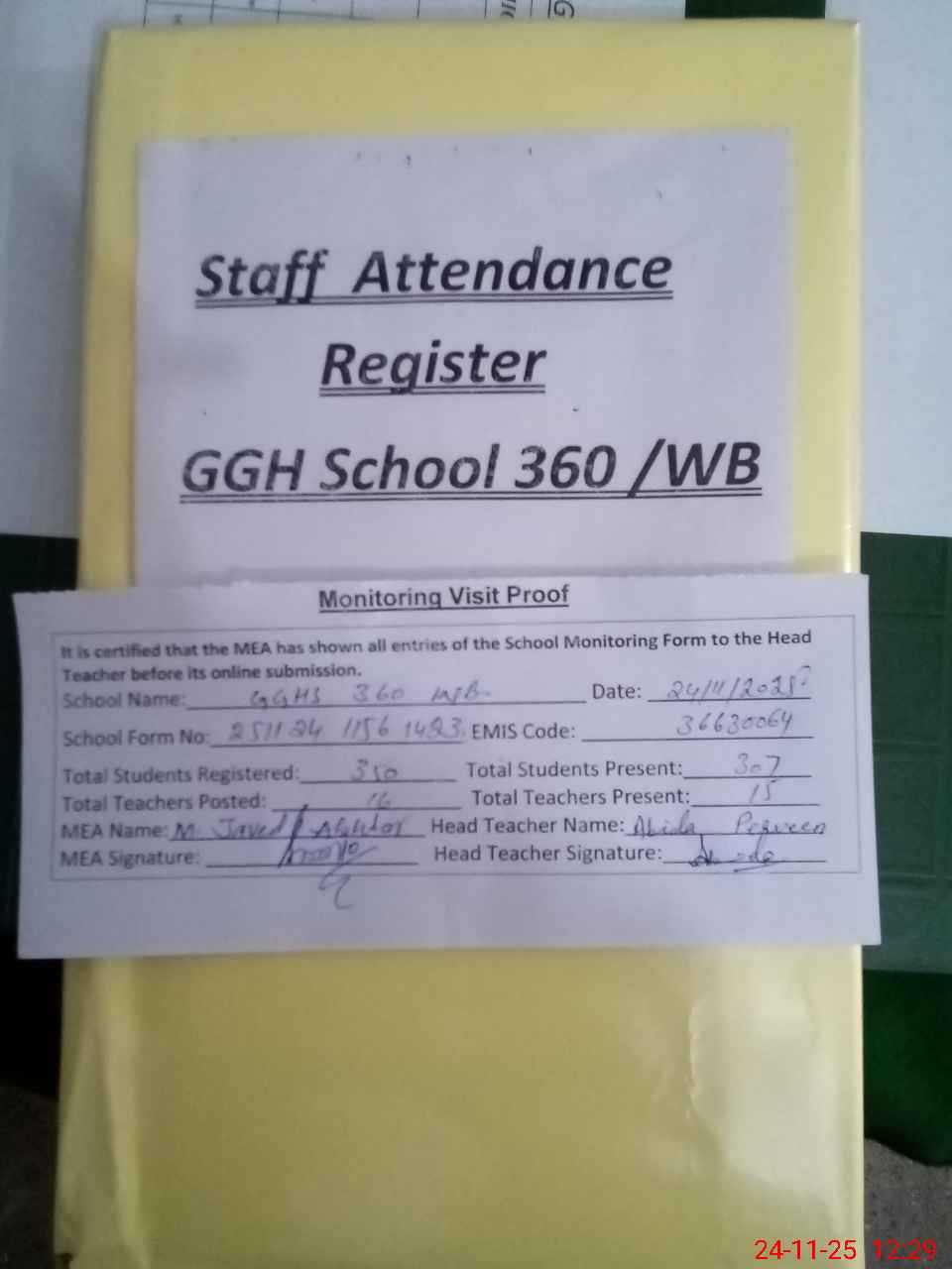 | Attendance Register | Head Teacher | MEA with School | Visit Proof |