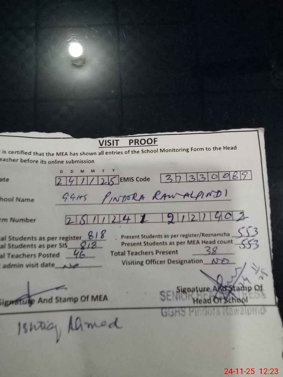 | Attendance Register | Head Teacher | MEA with School | Visit Proof |