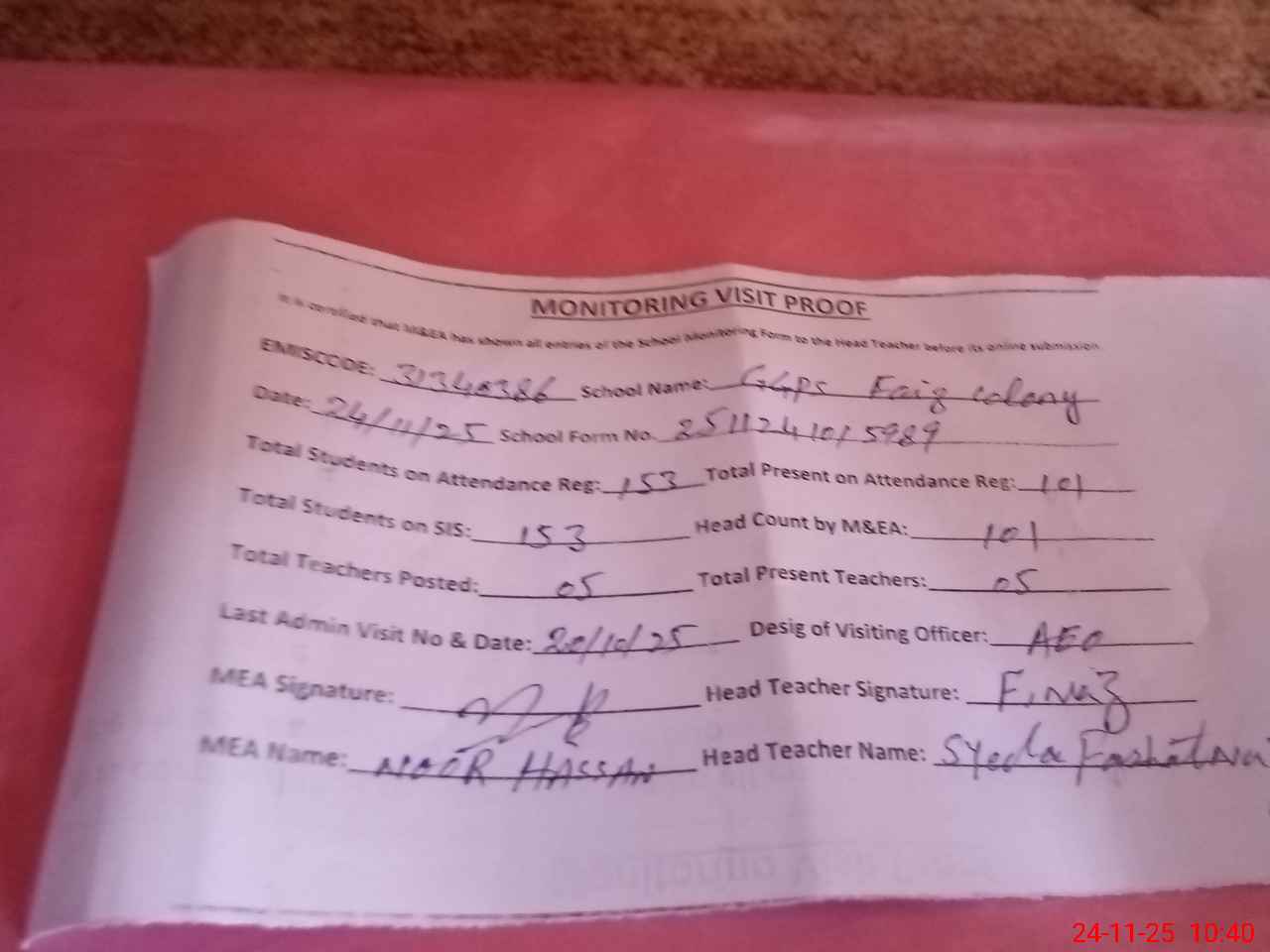 | Attendance Register | Head Teacher | MEA with School | Visit Proof |