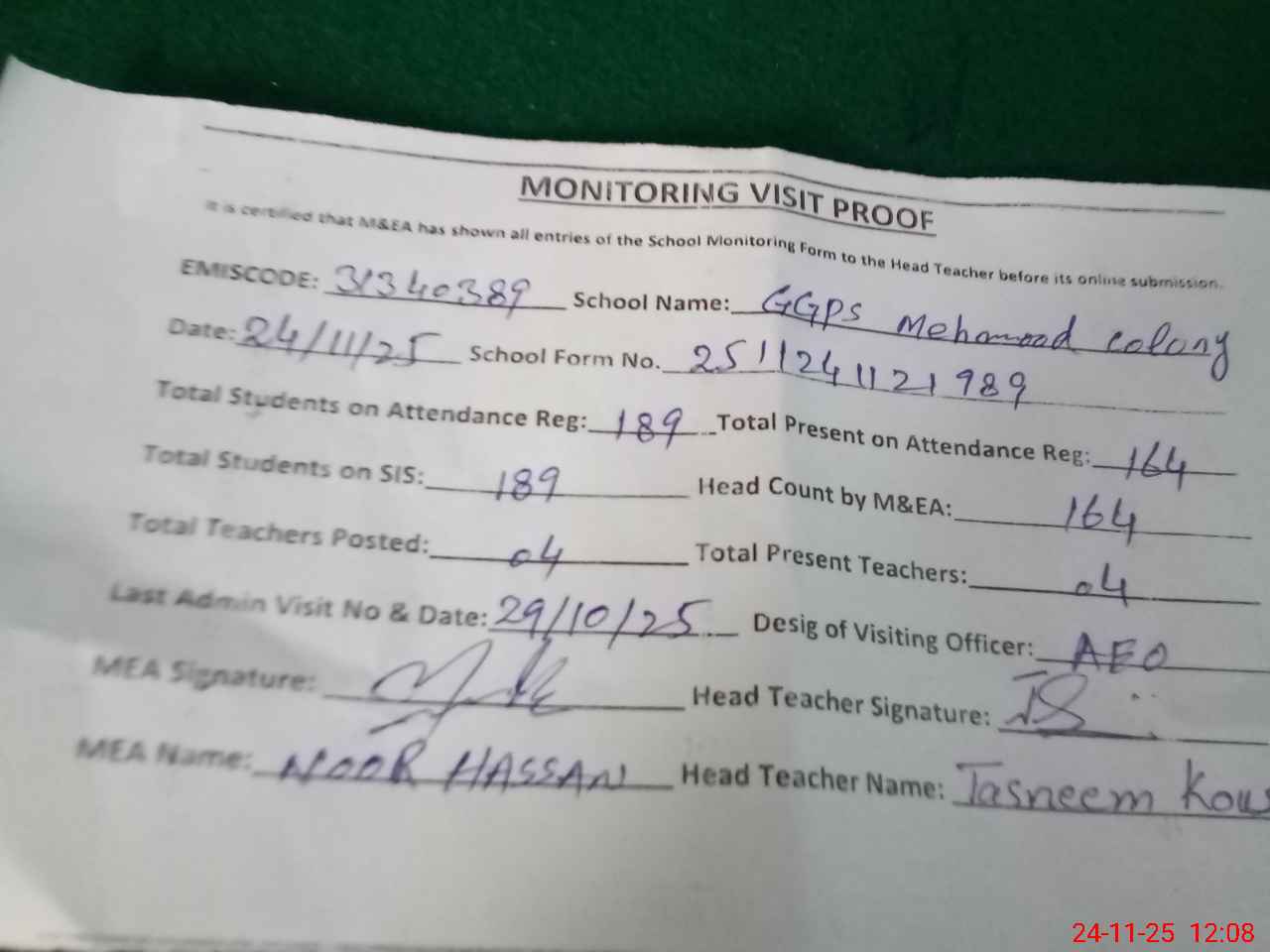 | Attendance Register | Head Teacher | MEA with School | Visit Proof |