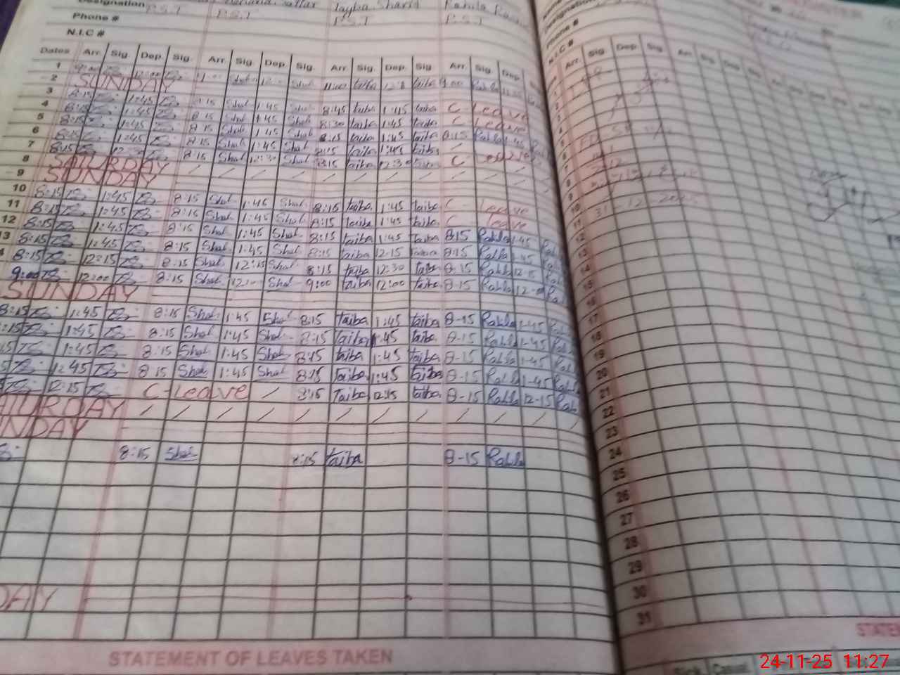 | CNIC | Full Name | Designation | R/C | Absence During Last Calender Month |