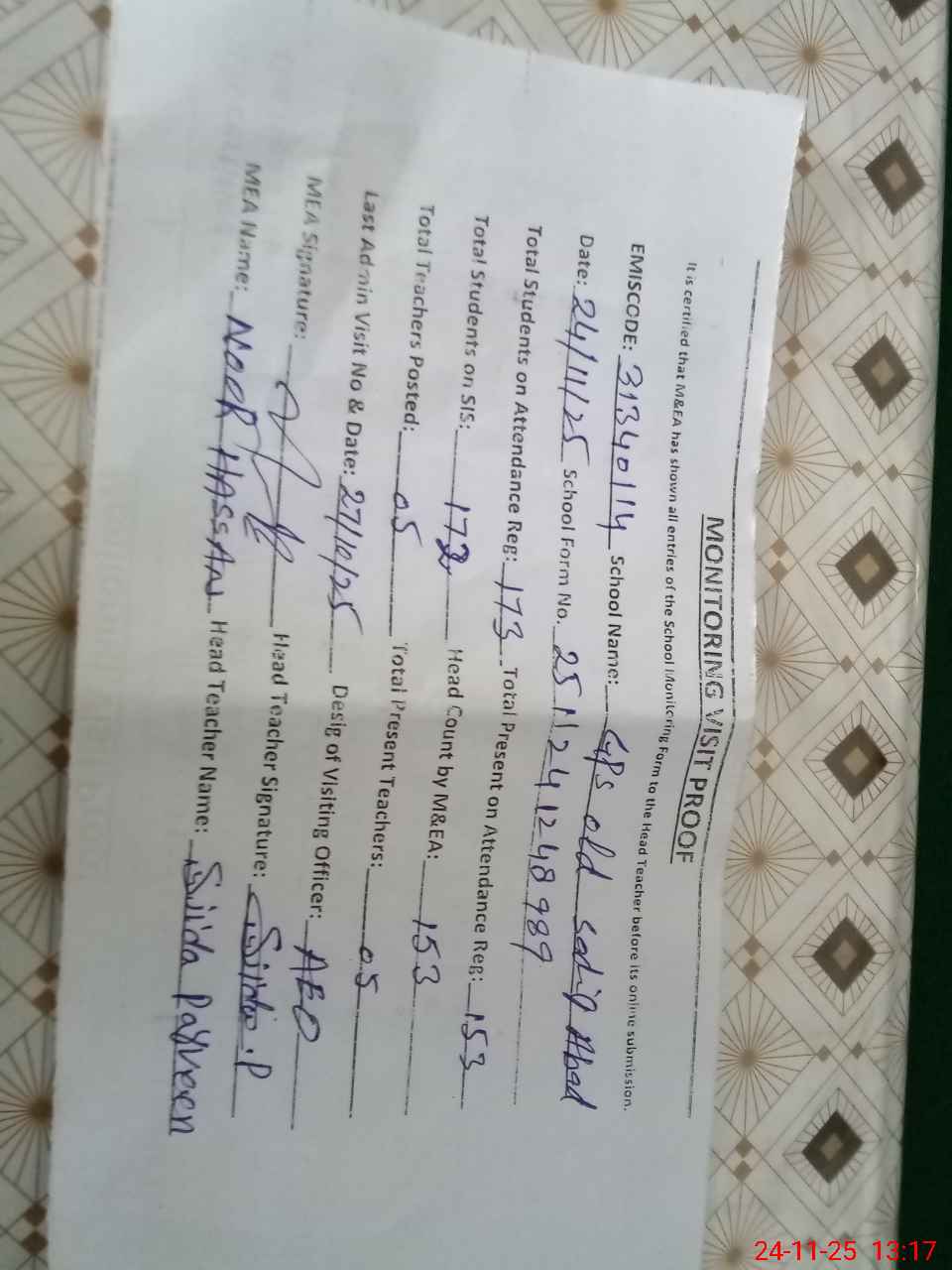 | Attendance Register | Head Teacher | MEA with School | Visit Proof |