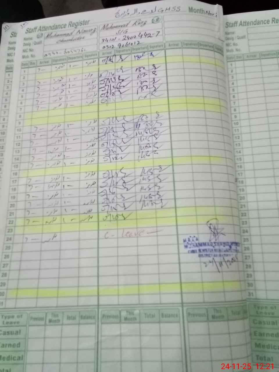 | CNIC | Full Name | Designation | R/C | Absence During Last Calender Month |