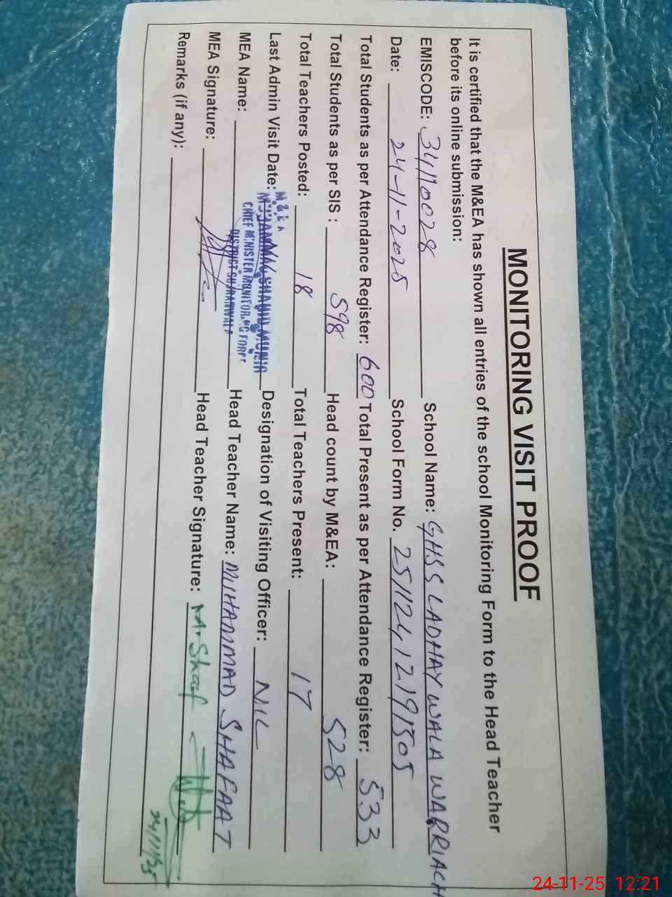 | Attendance Register | Head Teacher | MEA with School | Visit Proof |