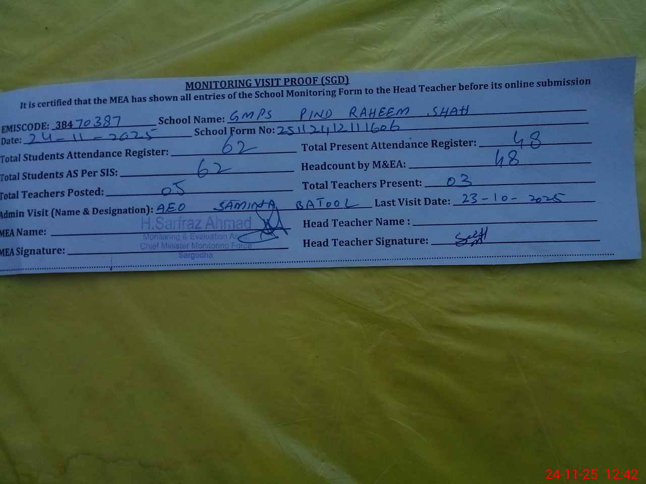 | EMIS Code: 38470387 | Name of School: GMPS PIND RAHEEM SHAH | |||