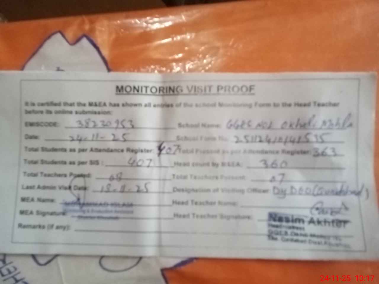 | Remarks (Use Separate Page if Required): Dy DEO visited school on 18 November 2025 Students strength on sis 407 | |||||