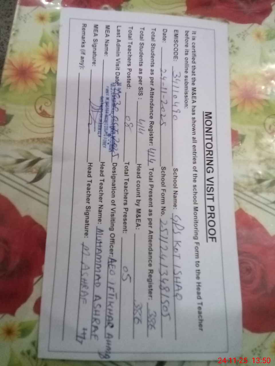 | Attendance Register | Head Teacher | MEA with School | Visit Proof |