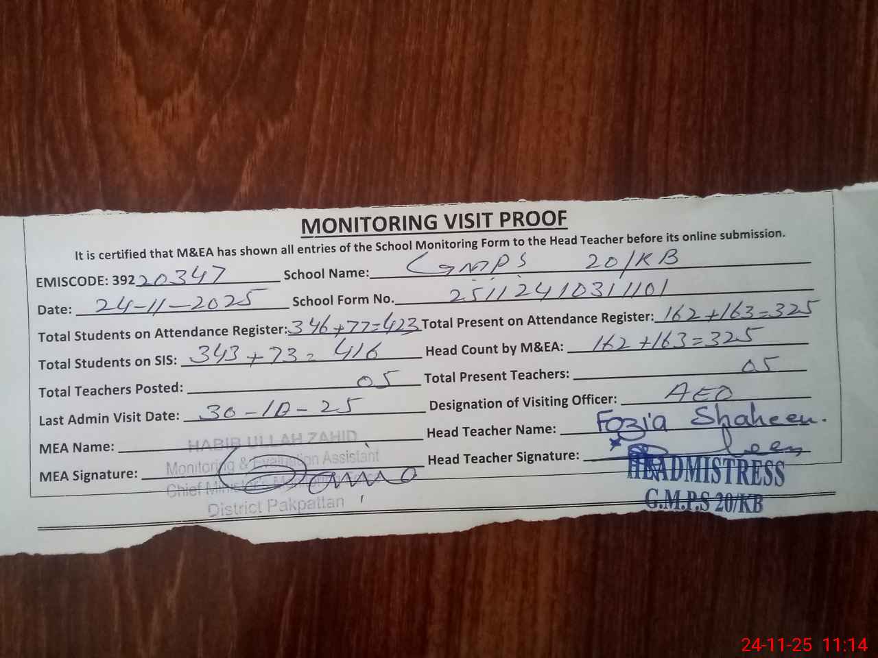 | EMIS Code: 39220347 | Name of School: GMPS CHAK NO. 20 KB | |||