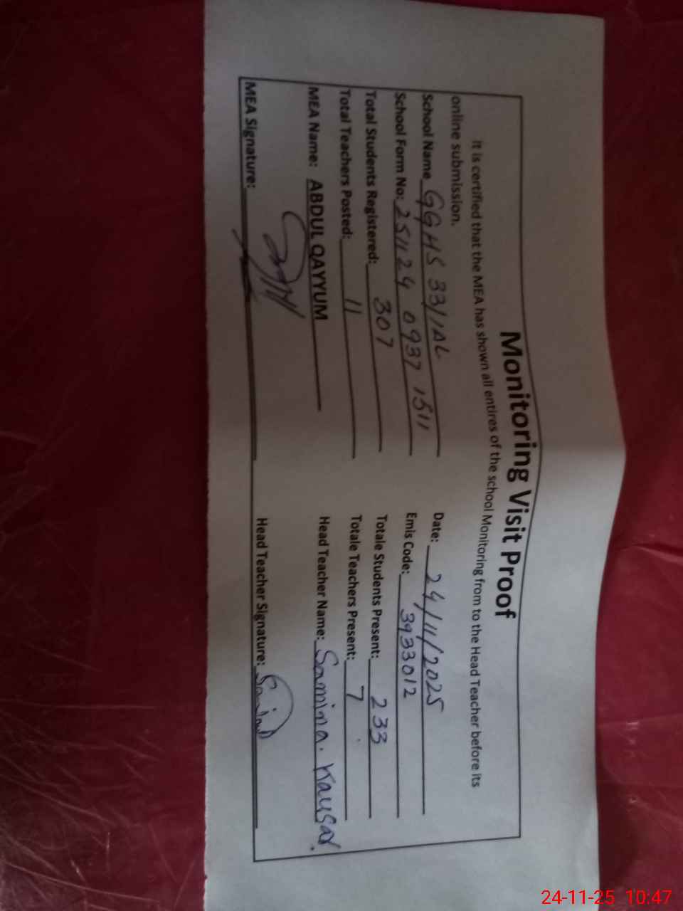 | Attendance Register | Head Teacher | MEA with School | Visit Proof |