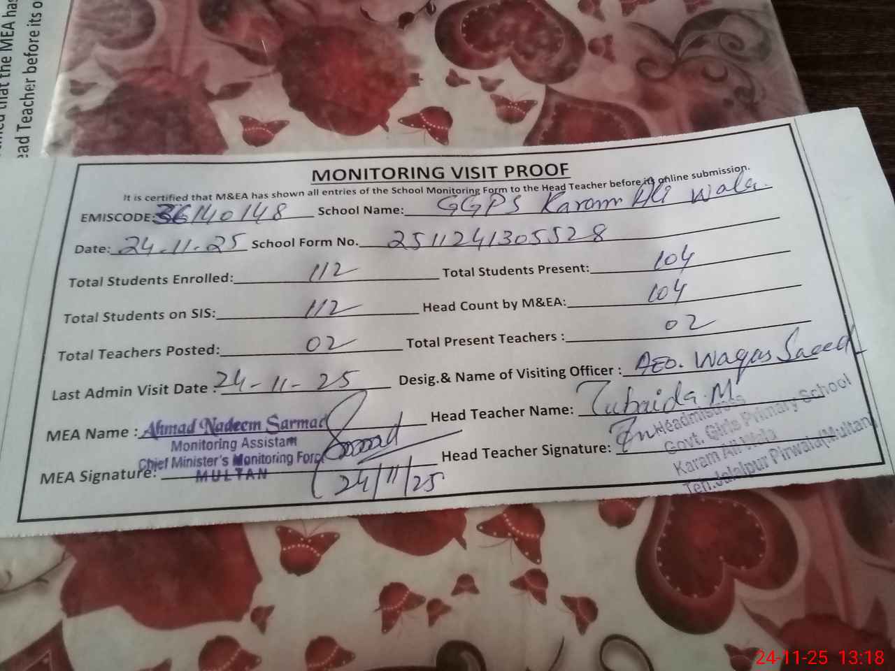 | EMIS Code: 36140148 | Name of School: GGPS KARAM ALI WALA | |||