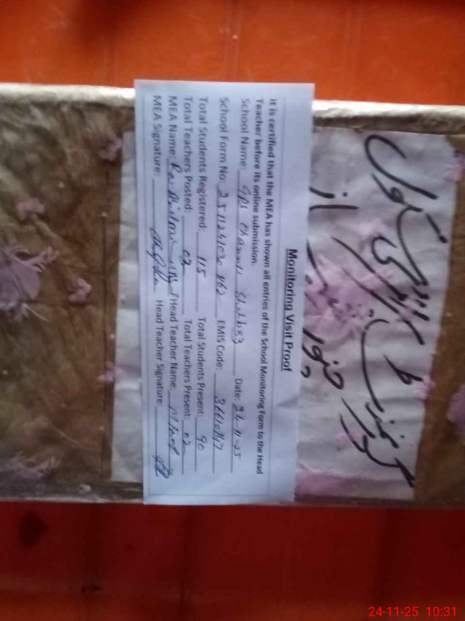 | Attendance Register | Head Teacher | MEA with School | Visit Proof |