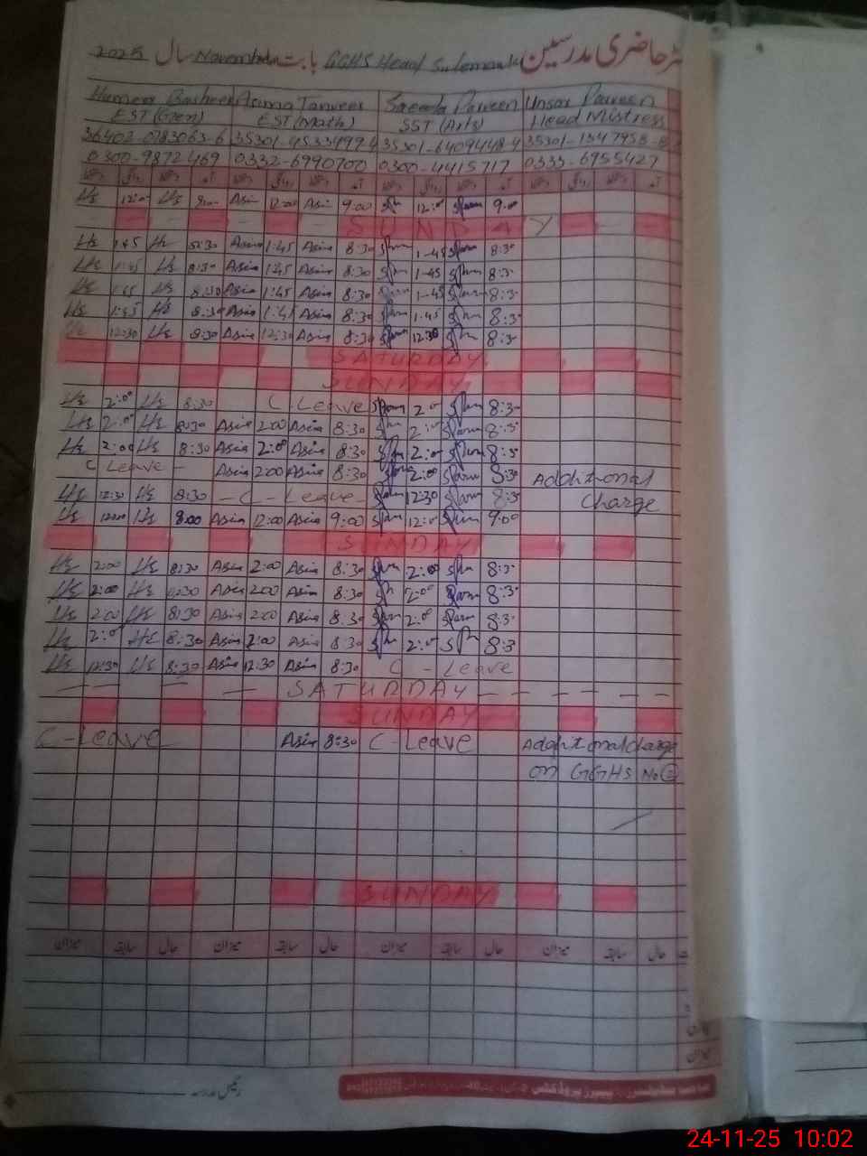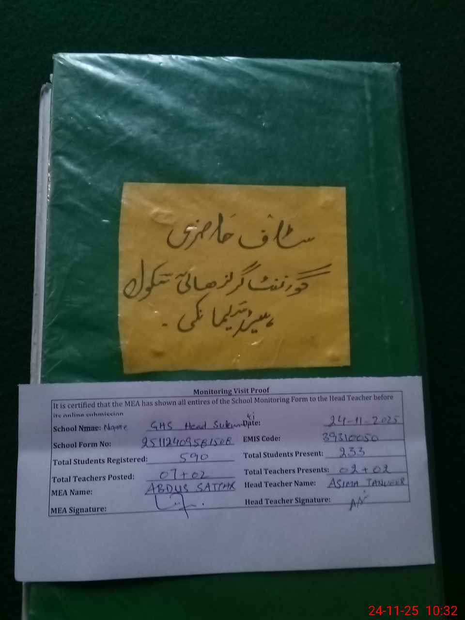 | Remarks (Use Separate Page if Required): chokidar Shahzad Hassan was suspended Since 19/08/2025 last administrator visit was carried out by DEO on 22/10/2025 FTF NSB and free text books record were not shown | |||||