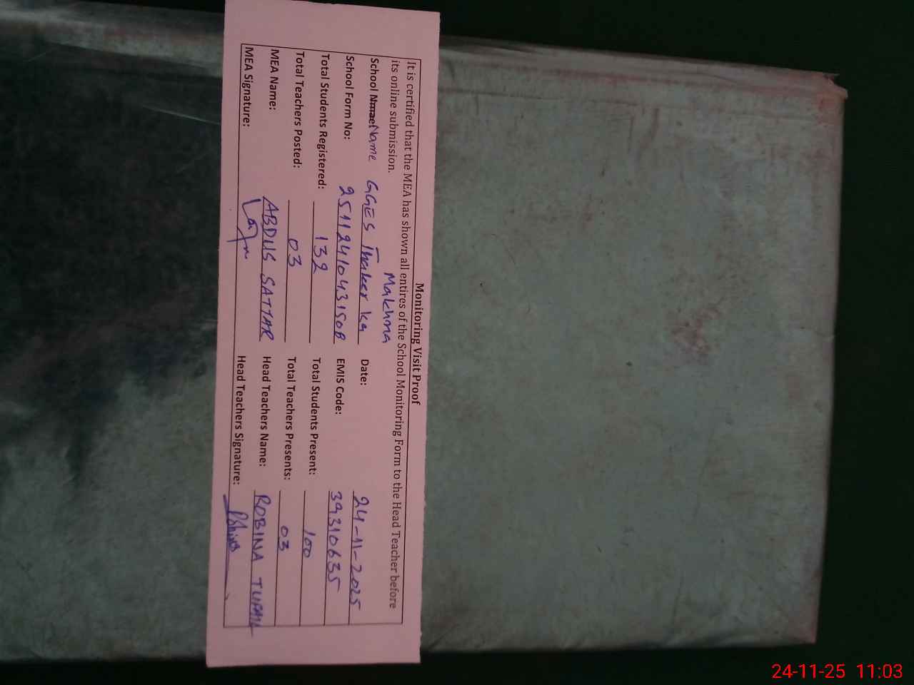 | Attendance Register | Head Teacher | MEA with School | Visit Proof |