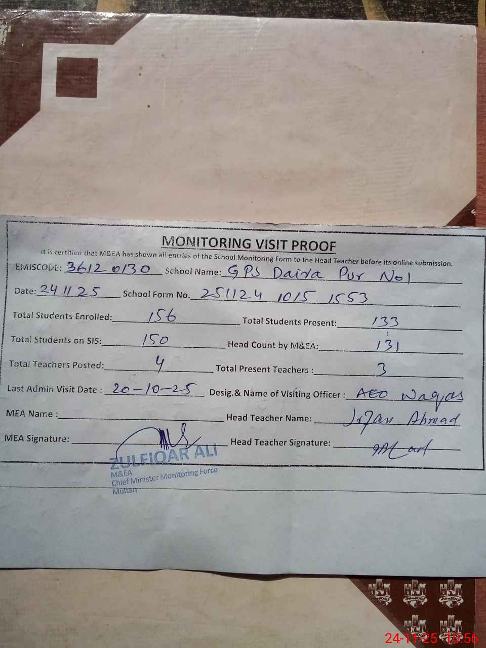 | EMIS Code: 36120130 | Name of School: GPS DAIRA PUR NO. 3 SHUJA ABAD | |||