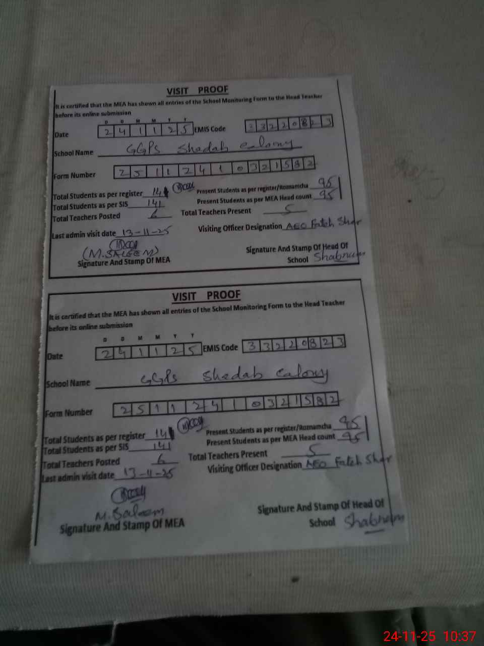 | Attendance Register | Head Teacher | MEA with School | Visit Proof |