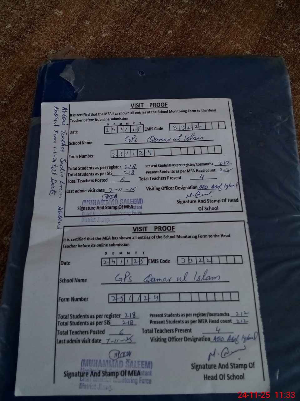 | Remarks (Use Separate Page if Required): teacher named Sadia Amin absent from 1st November, 2024 till date Good managed school | |||||