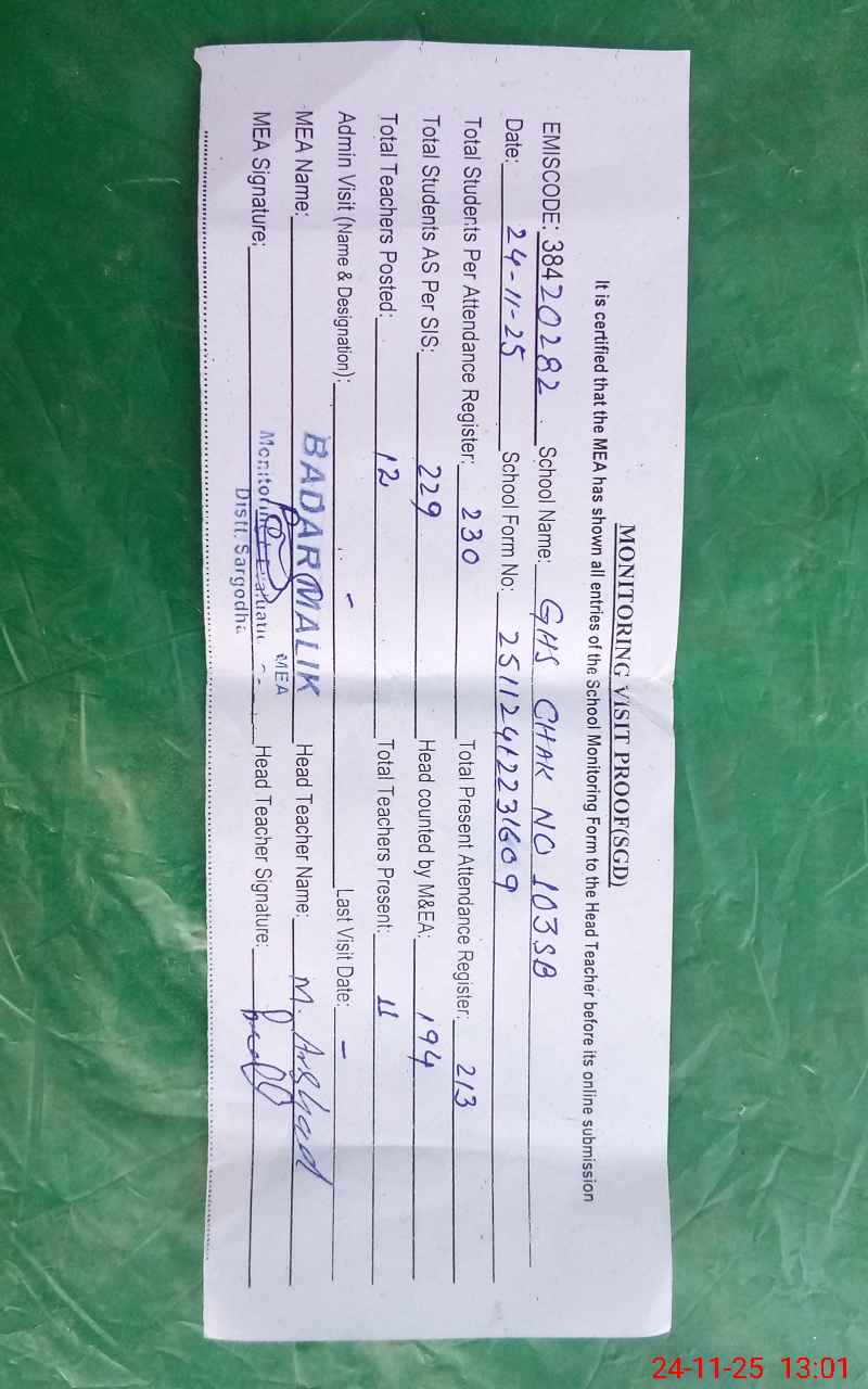 | EMIS Code: 38420282 | Name of School: GHS CHAK NO.103 SB | |||