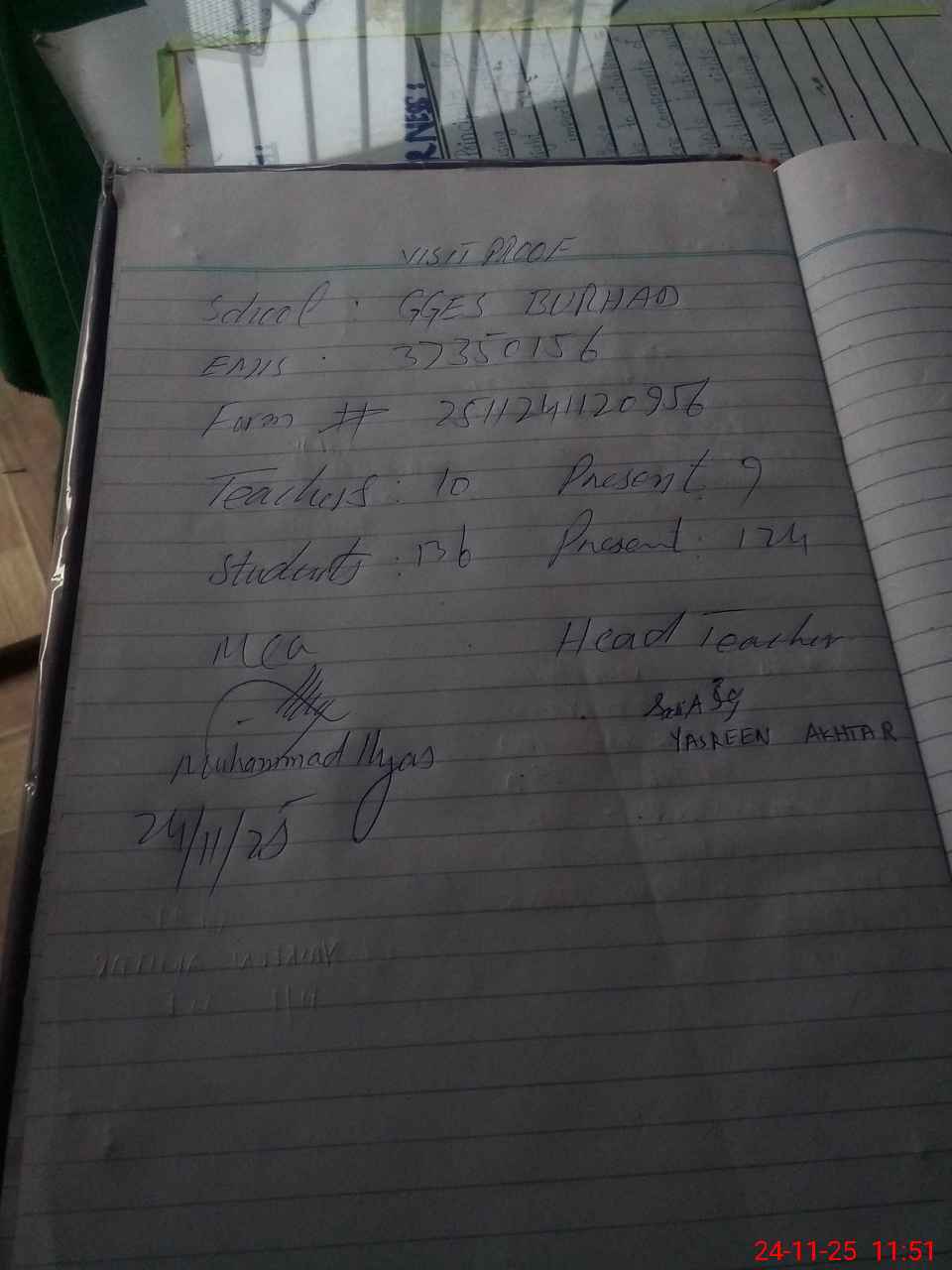 | Attendance Register | Head Teacher | MEA with School | Visit Proof |