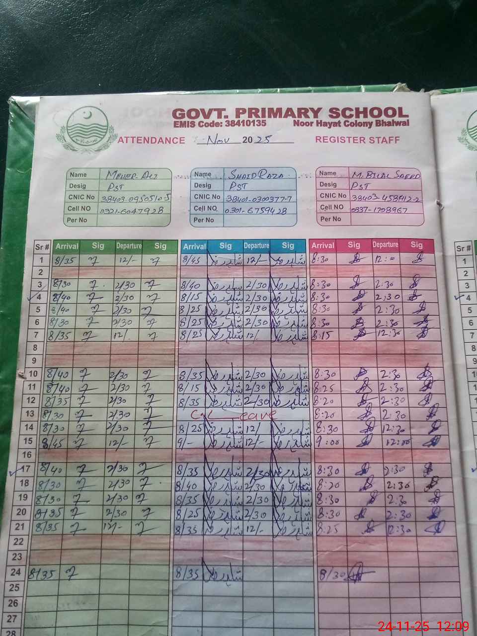 | CNIC | Full Name | Designation | R/C | Absence during last cal. month |