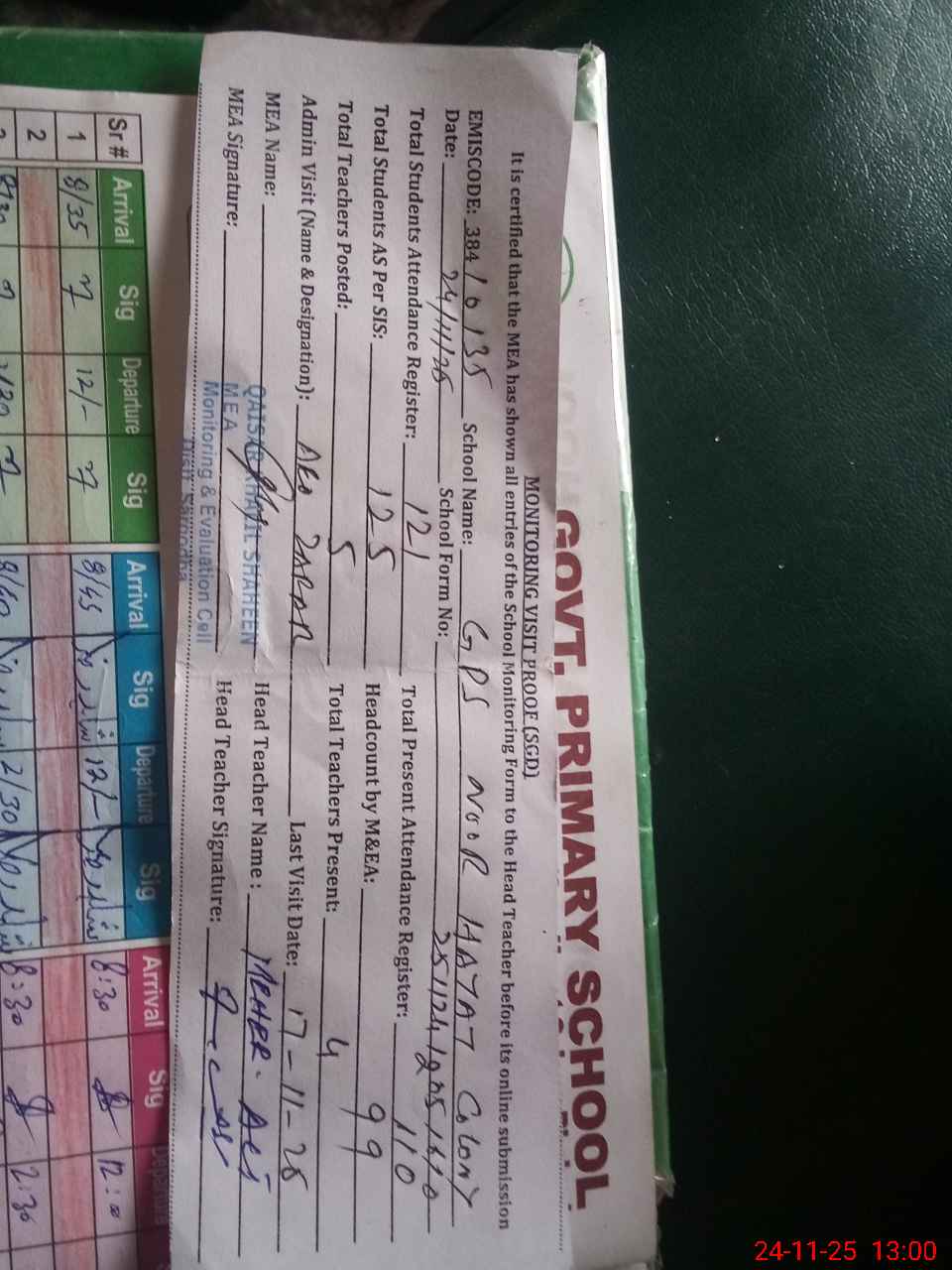 | Attendance Register | Head Teacher | MEA with School | Visit Proof |