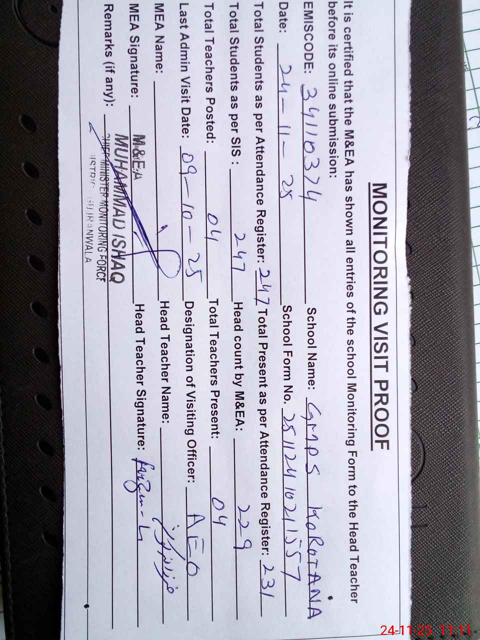 | Attendance Register | Head Teacher | MEA with School | Visit Proof |