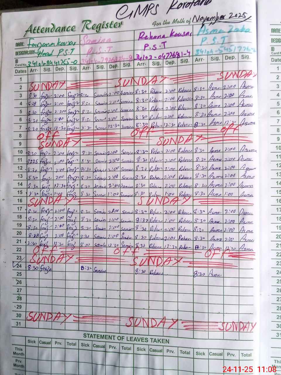 | CNIC | Full Name | Designation | R/C | Absence During Last Calender Month |