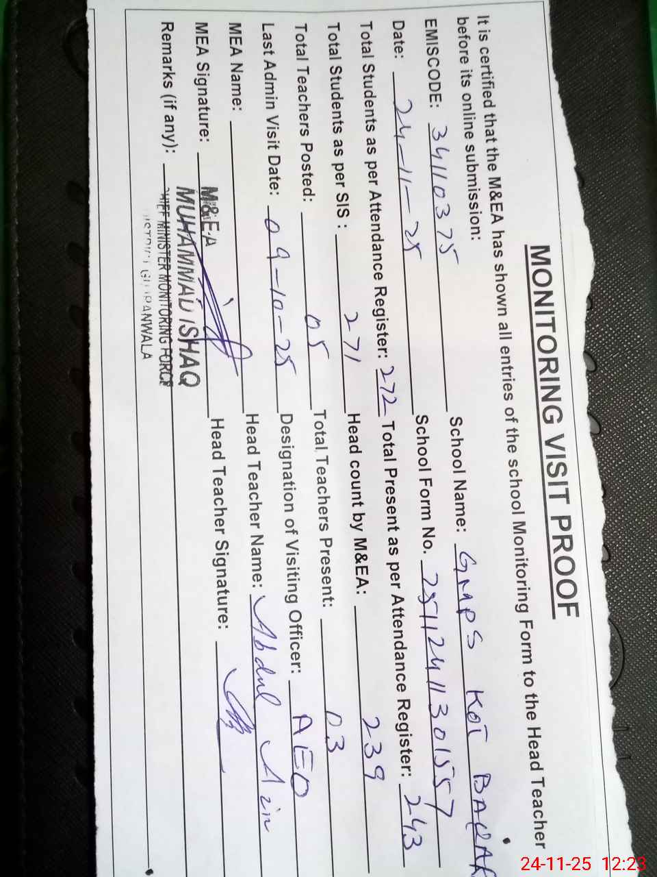 | Attendance Register | Head Teacher | MEA with School | Visit Proof |