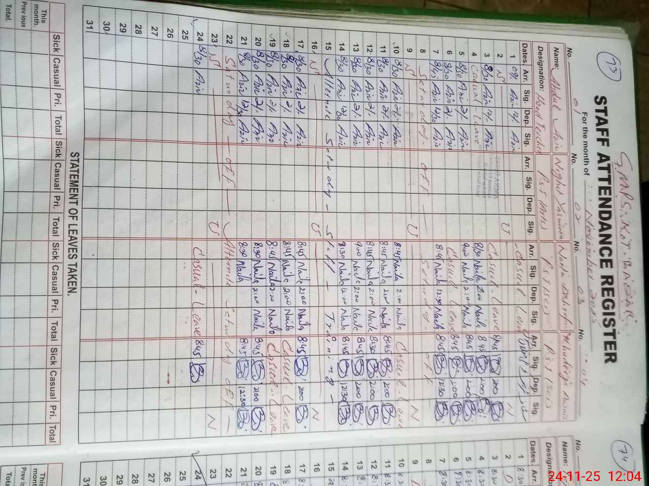 | Remarks (Use Separate Page if Required): PST NIGHAT YASMEEN ONLINE APPLY IDDT LEAVE ON 19 JULY 2025 BUT NOT YET Sanctioned | |||||