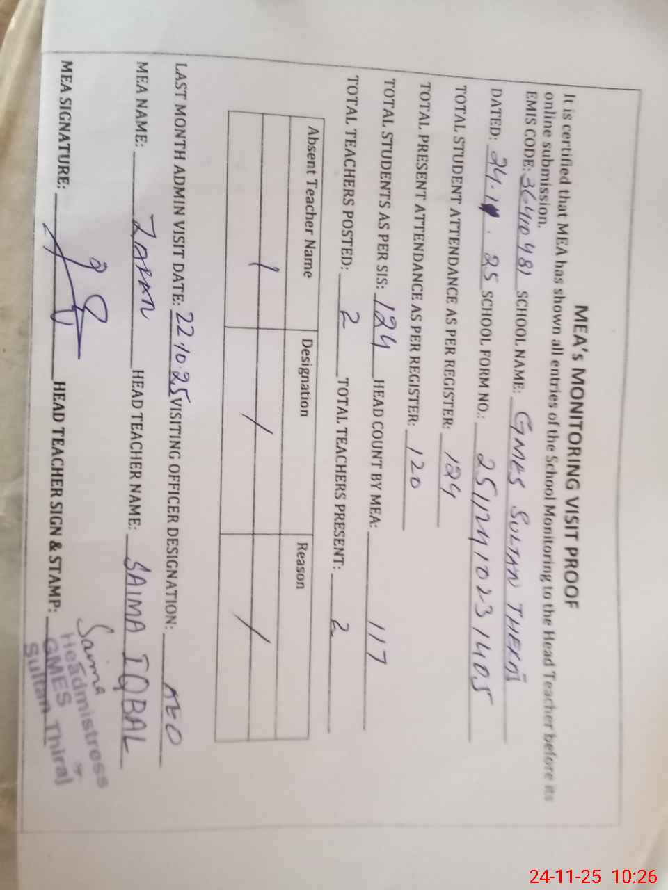 | Monitoring Date: 24-11-2025 | Start Time: 24-11-2025 09:45 AM | End Time: 24-11-2025 10:29 AM | Name of MEA: MU**** ZA**** IQ**** | |
