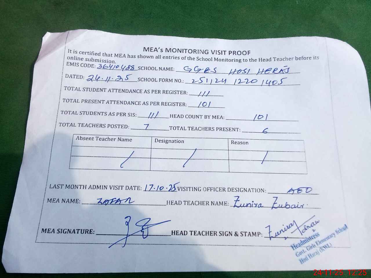 | Attendance Register | Head Teacher | MEA with School | Visit Proof |