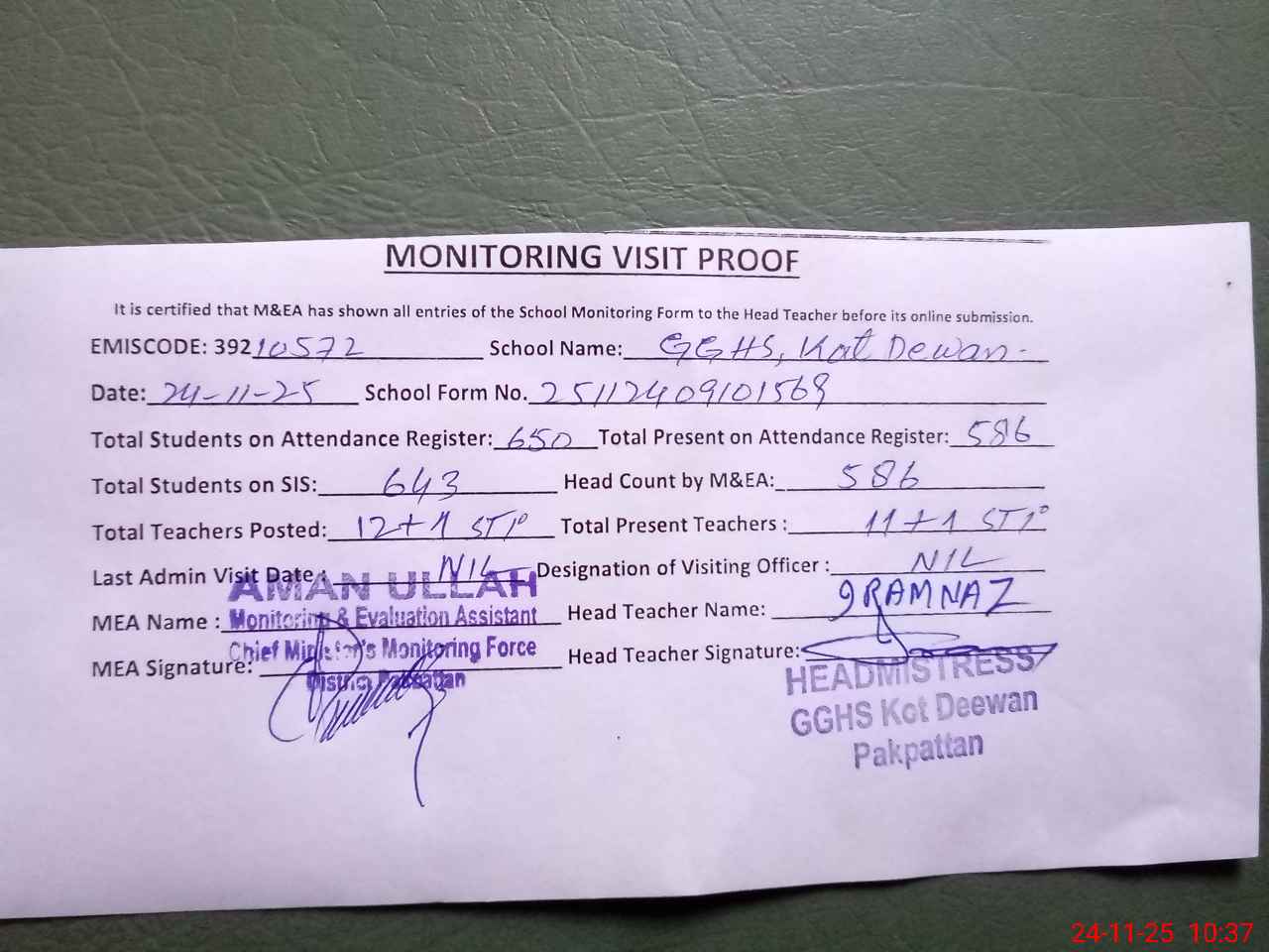 | Attendance Register | Head Teacher | MEA with School | Visit Proof |