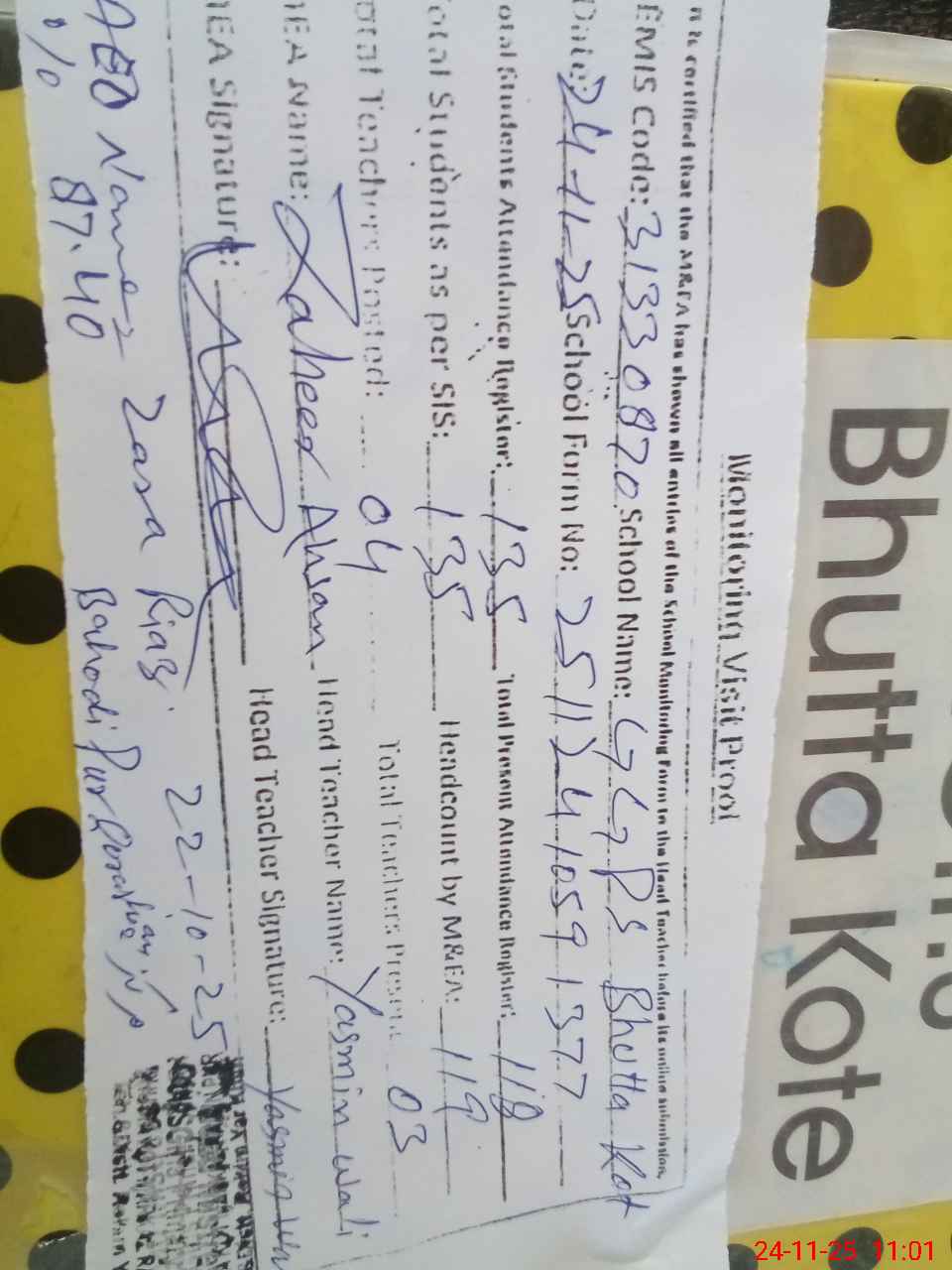 | Monitoring Date: 24-11-2025 | Start Time: 24-11-2025 10:23 AM | End Time: 24-11-2025 11:05 AM | Name of MEA: Za**** Ah**** | |