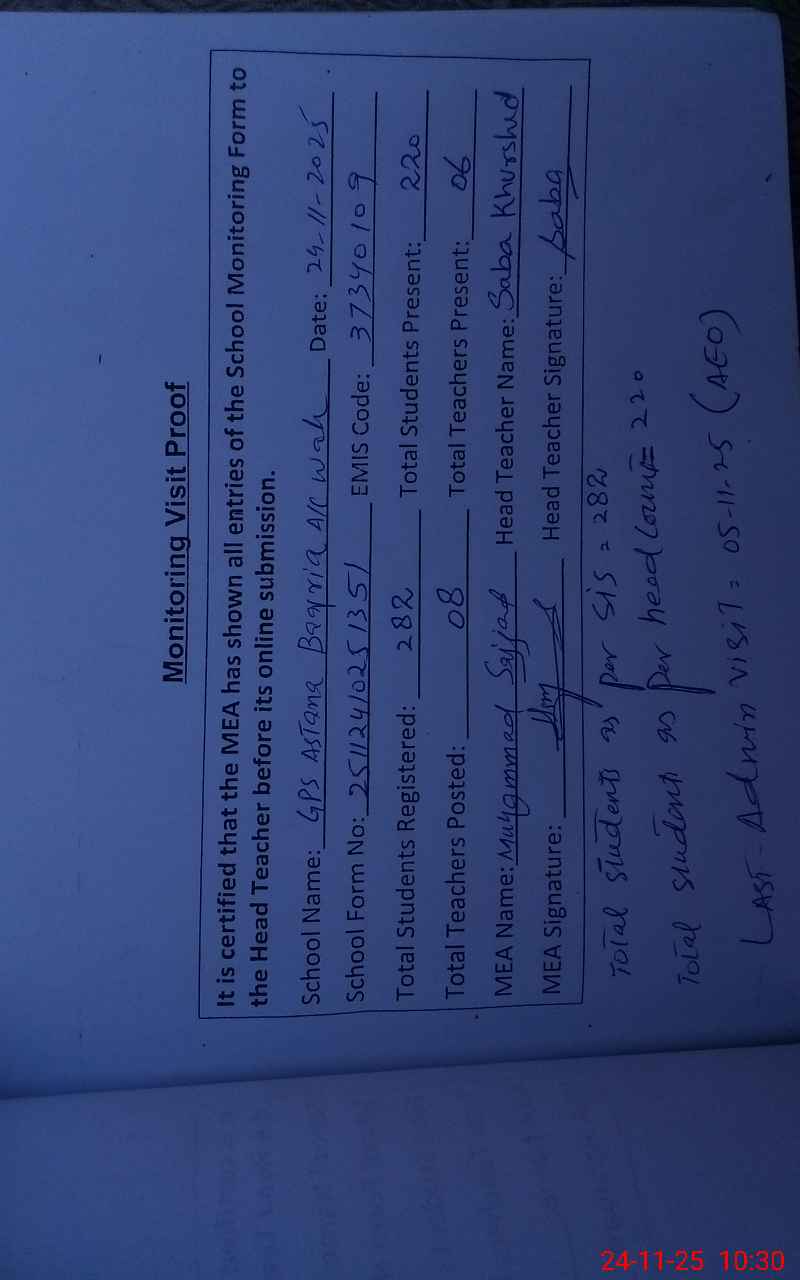| EMIS Code: 37340109 | Name of School: GPS ASTANA BAQRIA MAZAR COLONY | |||