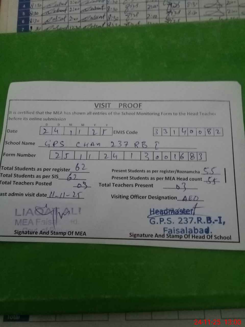 | Attendance Register | Head Teacher | MEA with School | Visit Proof |