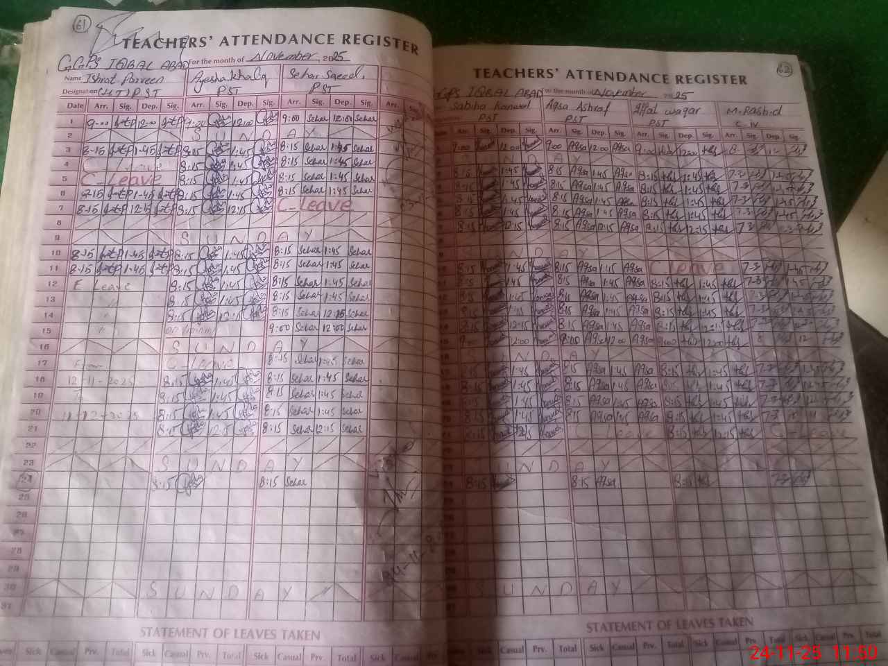 | Leave | Duty | Absent | Maternity | Medical | Ex- Pak |