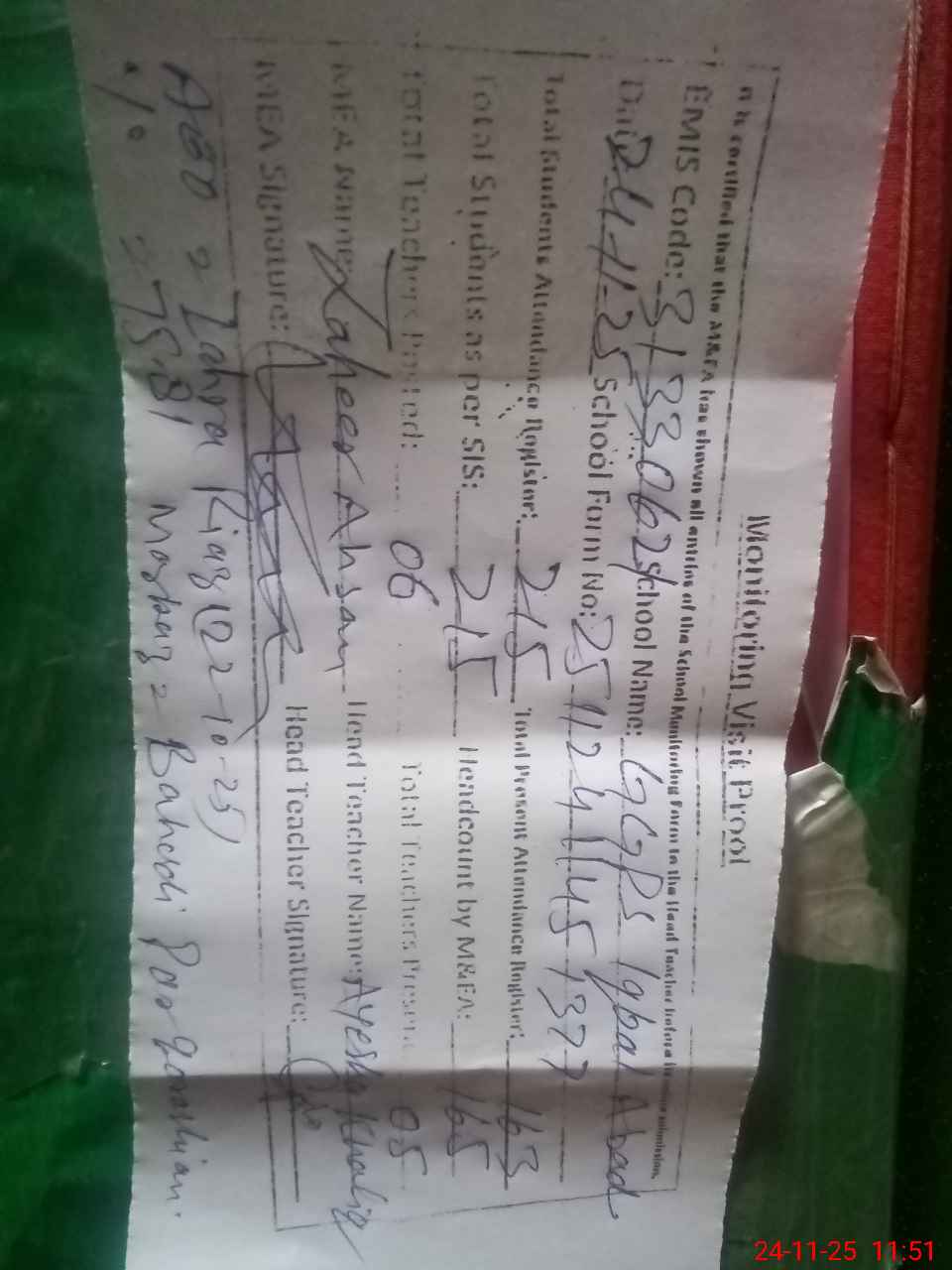 | Monitoring Date: 24-11-2025 | Start Time: 24-11-2025 11:06 AM | End Time: 24-11-2025 11:53 AM | Name of MEA: Za**** Ah**** | |